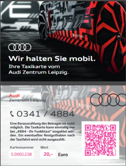 Audikarten werden von Audi an Kunden bei Reparaturen ausgegeben und gelten als Einmalkarten zur Bezahlung von Taxifahrten.